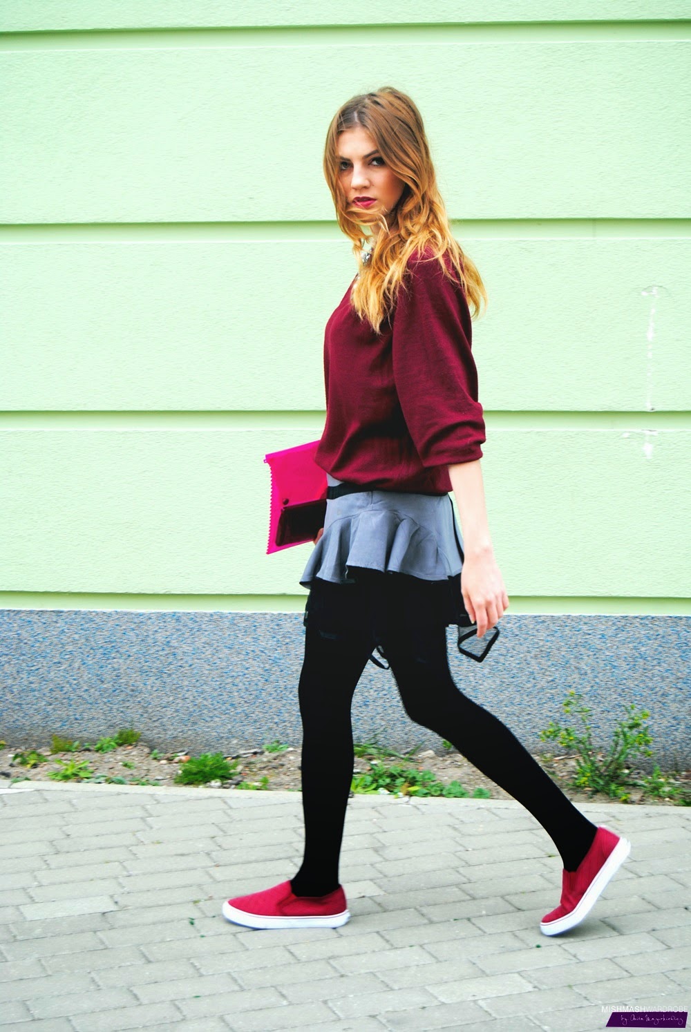 Przyszedł czas, że buty slip-on skradły także i moje serce. Jeszcze bardziej zakochałam się w ich kolorze. Bordo na moim "cichobiegach" idealnie zgrywa się z bordem na sweterku. Szara spódniczka z czarnym tiulem sprawia, że w stylizacji nie dominuje tylko i wyłącznie jeden kolor. Dodatkowo do stylizacji wybrałam neonową różową kopertówkę, która wbrew pozorom, idealnie pasuje do bardziej jesiennych przygaszonych kolorów. Duży elegancki naszyjnik wykonany z szarych i białych perełek na ciemno-srebrnym łańcuchu nadaje całemu lookowi jeszcze więcej oryginalności i stylu.